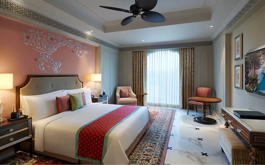 Mute The Leela Palace JaipurA majestic ode to Rajasthan’s regal heritage, The Leela Palace Jaipur is nestled in serene surrounds far from the city's bustle, where every moment echoes the grandeur of a bygone era.A graceful fusion of Rajputana and Mughal splendour, the palace enchants with gleaming white façades, intricate jaalis, and silver-trimmed chhatris. Stroll through marble corridors inlaid with parchin kari, past shimmering thikri mirrorwork and frescoes that reverberate regal tales of yore. Recline in breezy pavilions beside marble fountains, then as dusk falls, gather by the pool for an enchanting Rajasthani folk gala. Dine under starlit skies with the Aravallis on the horizon, before retreating to your boudoir - a sanctuary of indulgence. At every turn, The Leela Palace Jaipur is a celebration of timeless Indian luxury, resplendent in every detail. Stay & Revel Maharaja Suite Royal Suite Royal Villa with Plunge Pool Royal Villa with Courtyard Grand Villa with Terrace Grand Villa Palace Suites Palace Rooms Curated Offers Blissful Escapes Festive Getaway Time Travel with The Leela The Leela Palace Trail View All Epicurean Delights Jamavar An ode to Royal Kitchens of India Sukh Mahal All-day dining, where global and Indian flavours come together in a vibrant setting. Jharokha Bar Poolside bliss with rare malts, signature Aujasya cocktails, and the glow of lotus chandeliers. Celebrations & Conferences CelebrationsIntimate celebrations to grand galas, making every occasion timeless. Enquire Now Factsheet MeetingsAllow us to orchestrate every detail, so your meetings flow effortlessly. Enquire Now Factsheet The Leela Palace JaipurHotel CoordinatesHotel Address:Jaipur-Delhi Highway, NH 11, Kukas, Jaipur, Rajasthan - 30202860 mins from International Airport Telephone: +91 142 6350 000 Hotel Factsheet FAQs Enquire Now You must have JavaScript enabled to use this form. Name phone Phone Email Hotel*The Leela Palace Jaipur Purpose of EventWeddingsCelebrations Need a stay?YesNo . Additional Information Math question 4 + 9 = Solve this simple math problem and enter the result. E.g. for 1+3, enter 4. Mobile Number Enquire Now You must have JavaScript enabled to use this form. Name Phone Email Hotel*The Leela Palace Jaipur Additional Information Math question 10 + 0 = Solve this simple math problem and enter the result. E.g. for 1+3, enter 4. Mobile Number